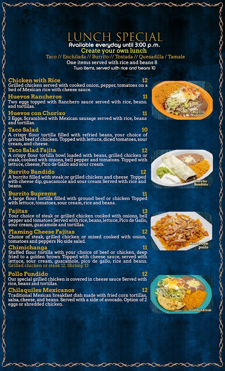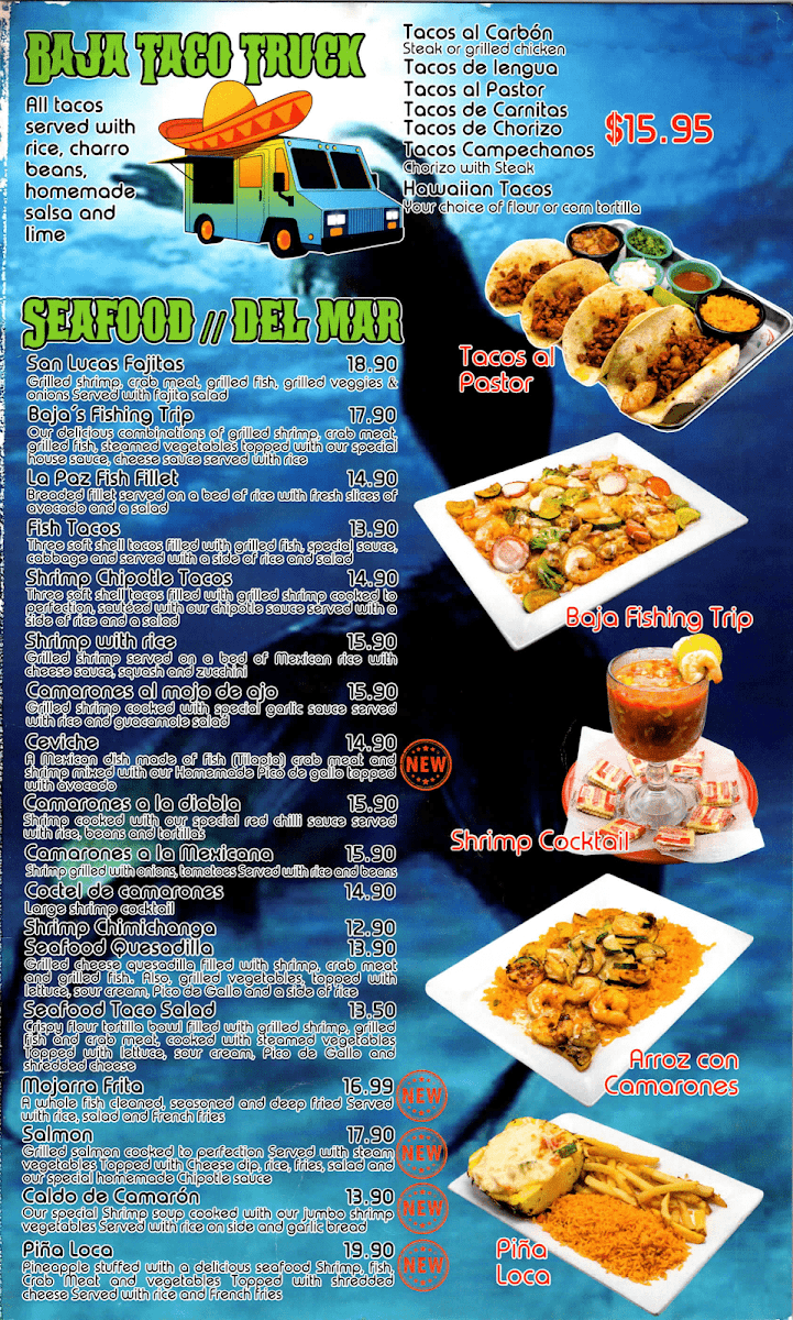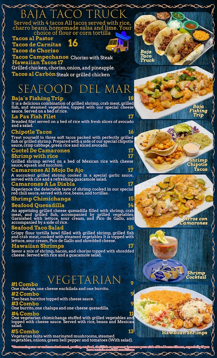 The menu at Baja California Cantina & Grill offers a welcoming blend of traditional Mexican dishes and casual favorites, crafted to suit a variety of dining moments. Whether you're stopping by for a relaxed lunch, a comfortable dinner with friends, or a flavorful bite any time of day, the selection balances fresh ingredients with familiar flavors.